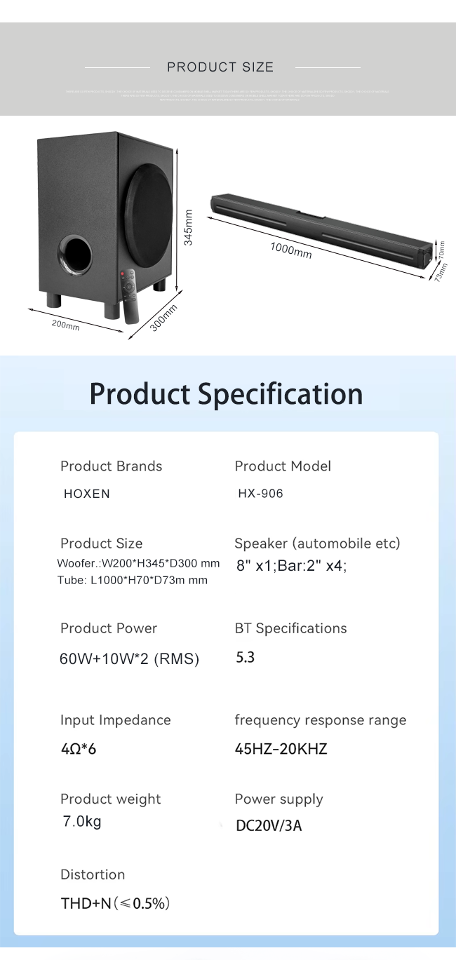 Product size (mm) | Woofer:200*345*300mm/Tube:1000*70*73mm |