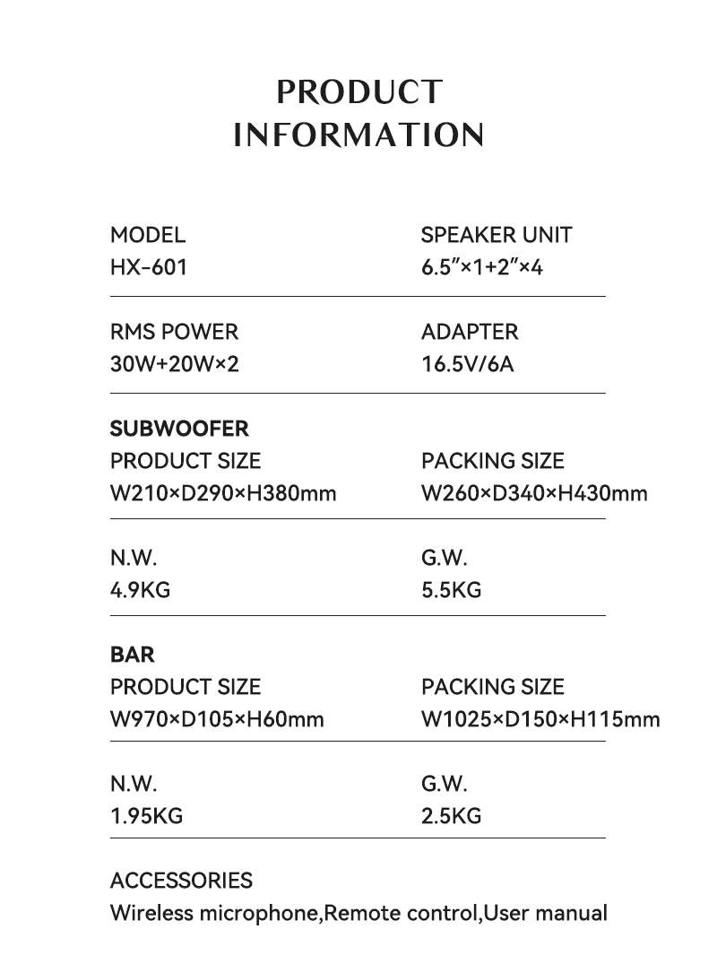 Product size (mm) | Woofer:210*290*380mm/Tube:970*105*60mm |